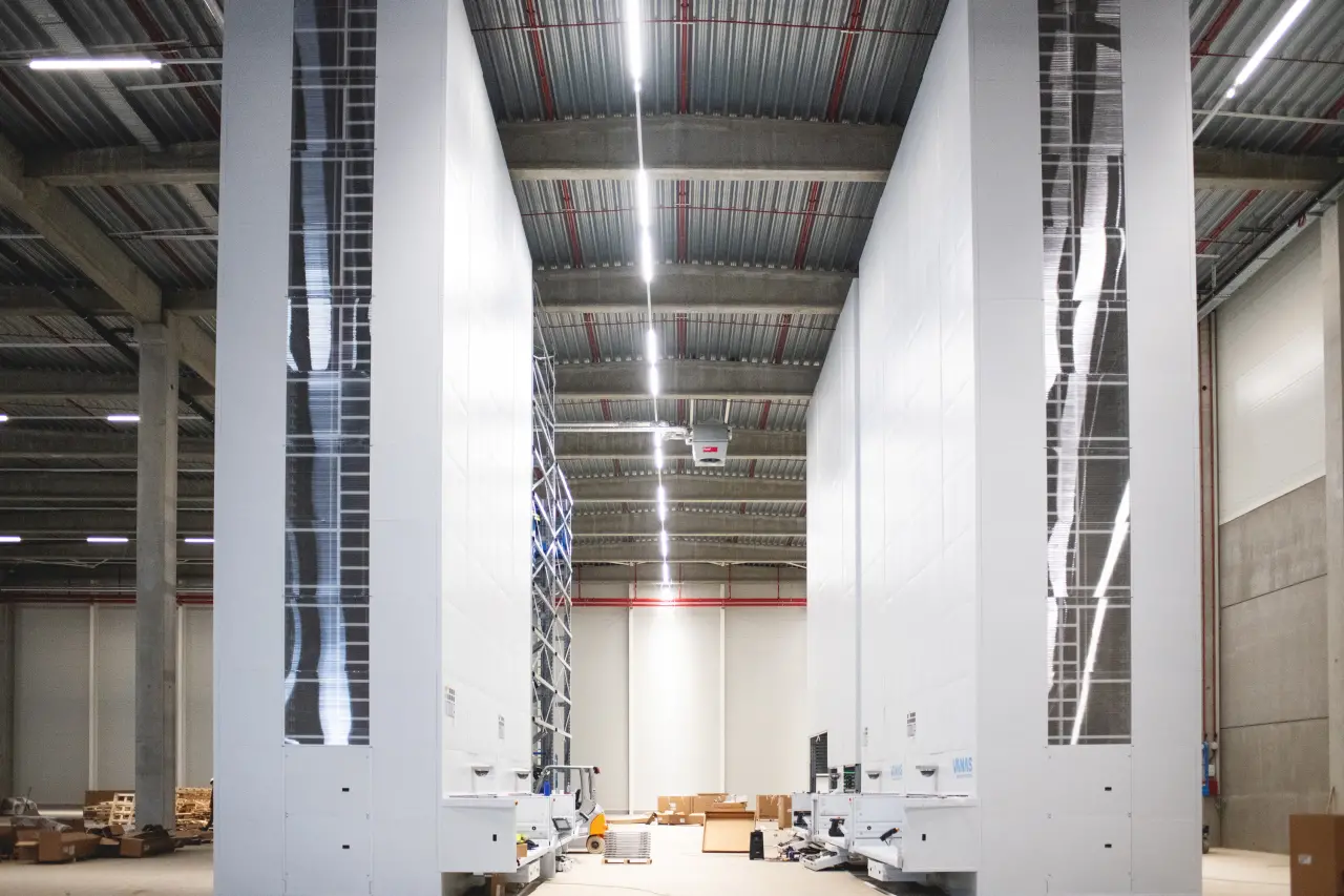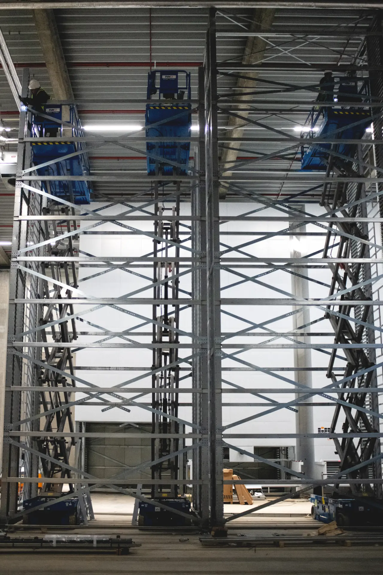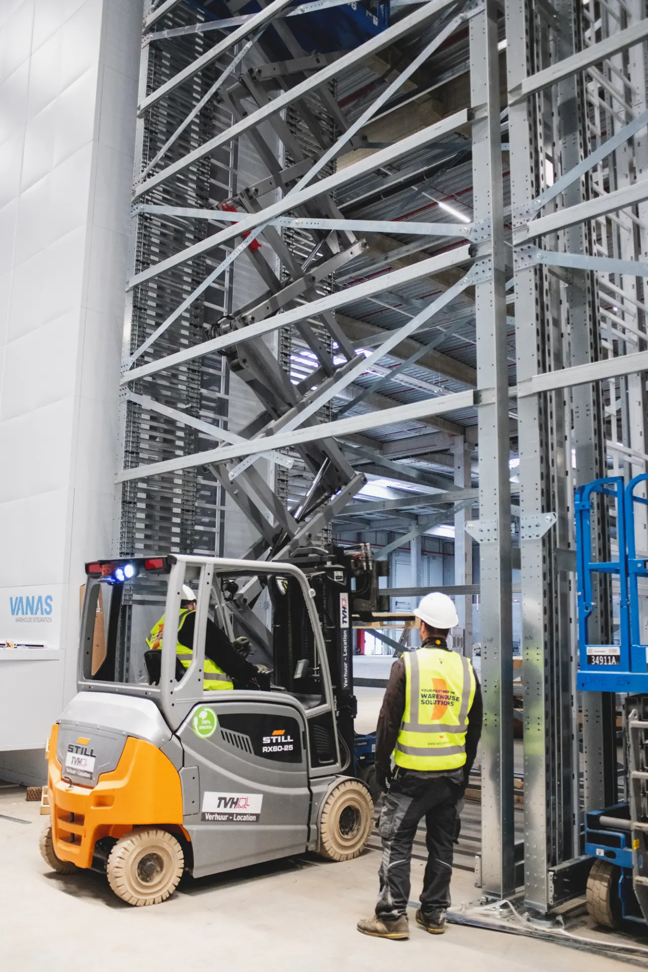 Om de logistieke efficiëntie verder te verhogen, is er gekozen voor een geavanceerd systeem van conveyors, die de in- en outbound van producten faciliteren. Deze zijn volledig geïntegreerd met het WMS-software van zowel Vanas als de klant, wat zorgt voor een naadloze en foutloze productstroom. Naast de liften heeft ons team ook de volledige hal uitgerust met palletrekken. Met 17 rijen van 22 secties, en rekken die tot 13 meter hoog reiken, was dit een omvangrijke taak. Ons team van ervaren techniekers, onder leiding van een projectmanager, zorgde ervoor dat alles volgens planning verliep. Ons backoffice team speelde ook een cruciale rol in het ondersteunen van het project, waarbij zij continu klaar stonden om waar nodig bij te sturen.